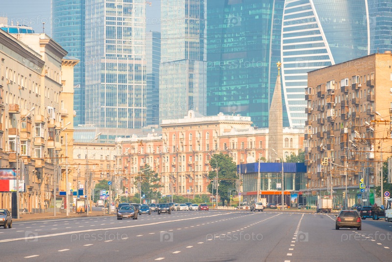 Московская городская улица на фоне небоскребов Москва-Сити ранним утром