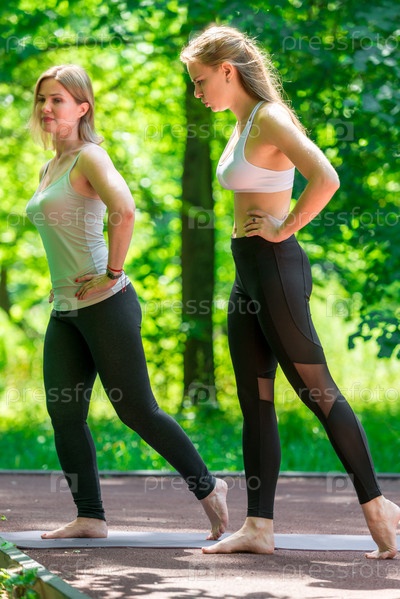 Занятия пилатесом с индивидуальным тренером в парке в летний день