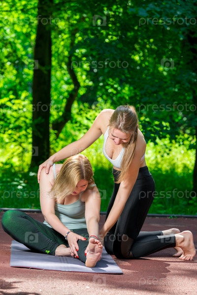 Женщины в парке во время йоги, растяжки