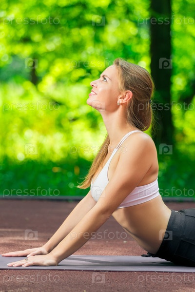 Молодая стройная женщина делает упражнения на растяжку в парке на свежем воздухе