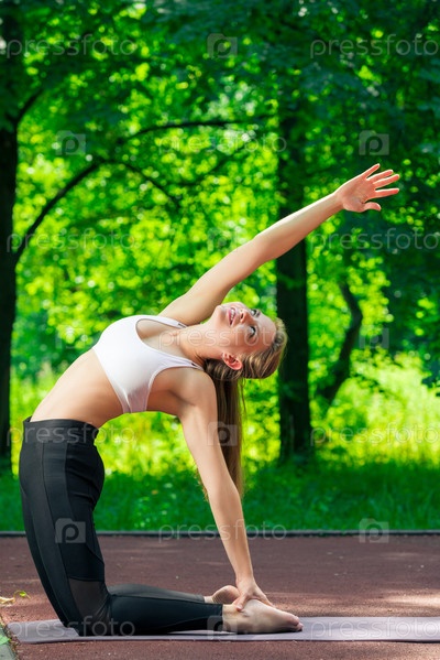 Гибкая худая девушка занимается йогой в парке в летний день