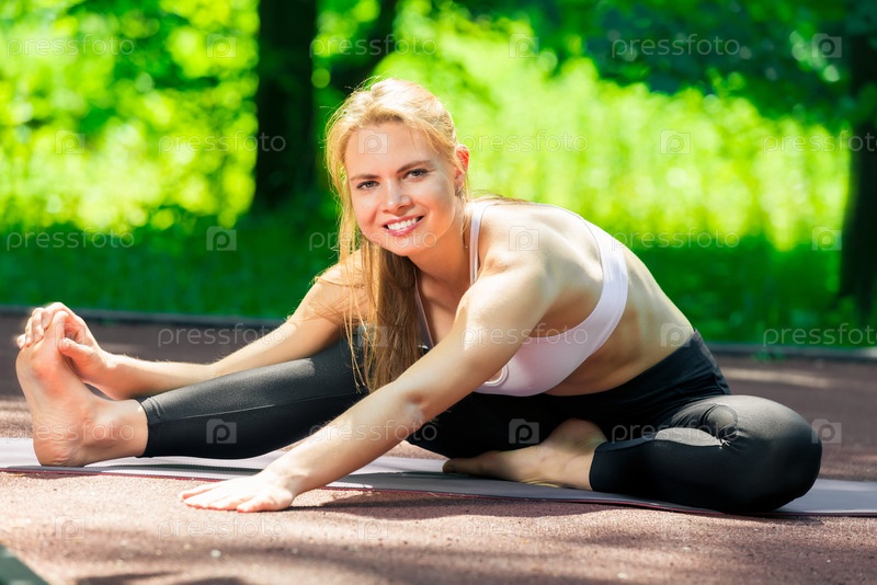 Красивый пилатес тренер выполняет упражнения на растяжку в парке в солнечный день