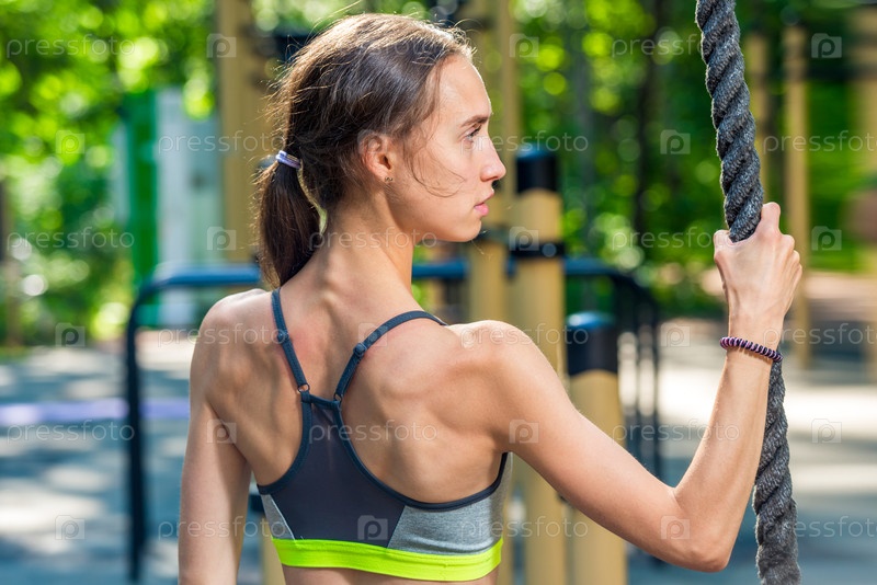Портрет со спины спортивной женщины с веревкой на детской площадке, съемка во время тренировки