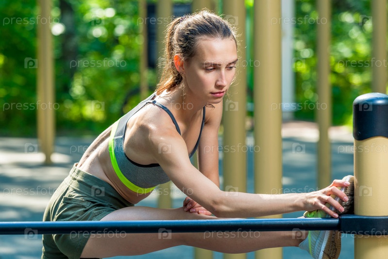 Растяжка на детской площадке в летнее утро, портрет спортсменки