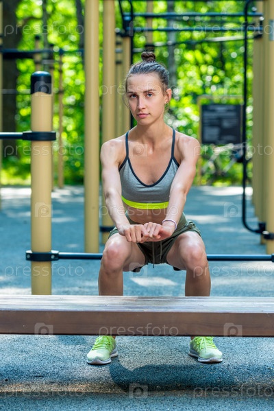 Работа над фигурой, портретом спортсменки в парке на детской площадке