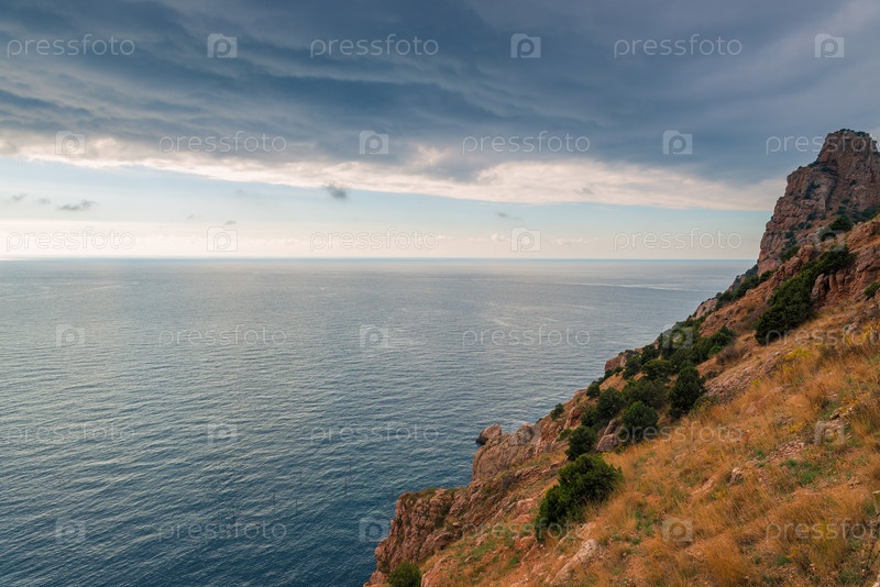 Драматическое небо, скалистое побережье и спокойное море перед бурей