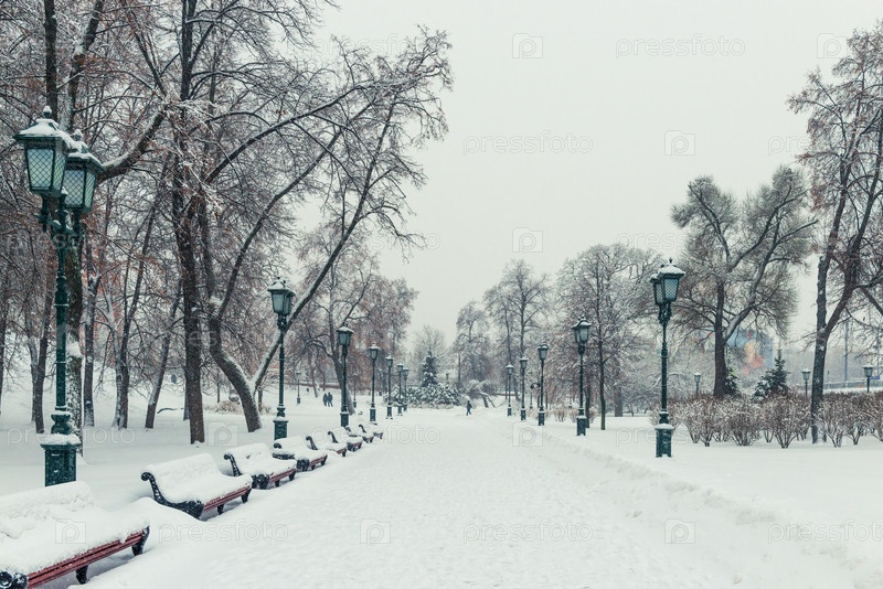 Зимний городской парк зимой, огни и скамейки покрыты снегом