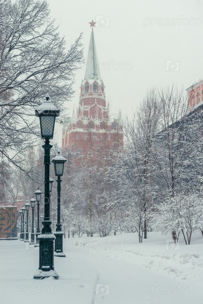 Кремлевская башня, городской парк в центре Москвы, зимний городской пейзаж