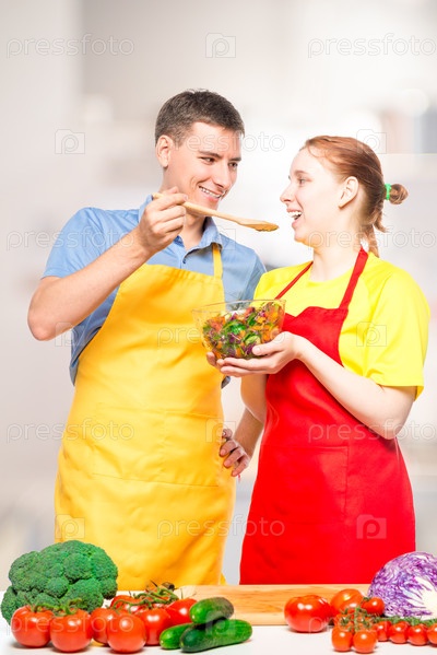 Мужчина с деревянной ложкой и девушка с миской салата пробуют еду, приготовленную вместе на кухне