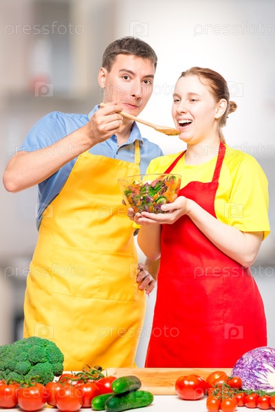 Мужчина с деревянной ложкой кормит девушку полезным овощным салатом на кухне