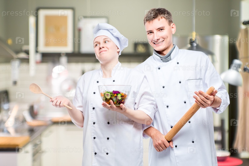 Эмоциональные молодые профессиональные повара с блюдом на фоне кухни