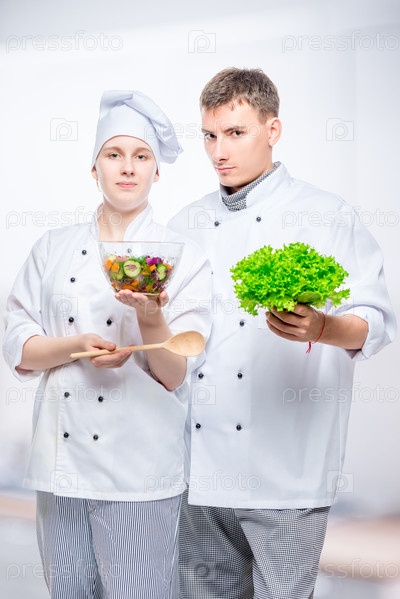 Молодые повара в костюмах с салатом в руках на сером фоне