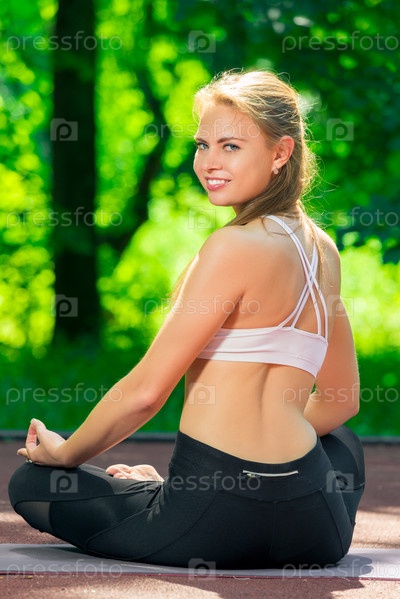 Йога асаны - вид на спину женщины в позе лотоса в парке