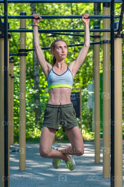 Молодая и сильная девушка делает упражнения на прессе на баре в парке