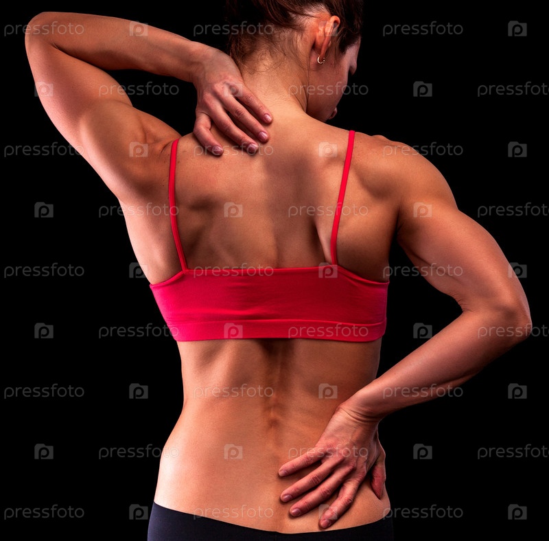 Бодибилдер женщина страдает от боли в спине и шее после тренировки, черный фон