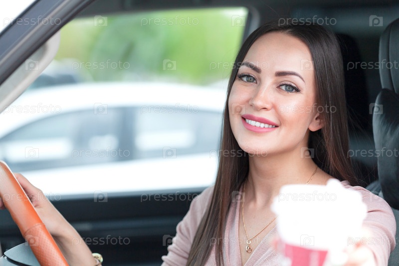 Портрет улыбающейся дружелюбной девушки-водителя в машине с бумажной чашкой