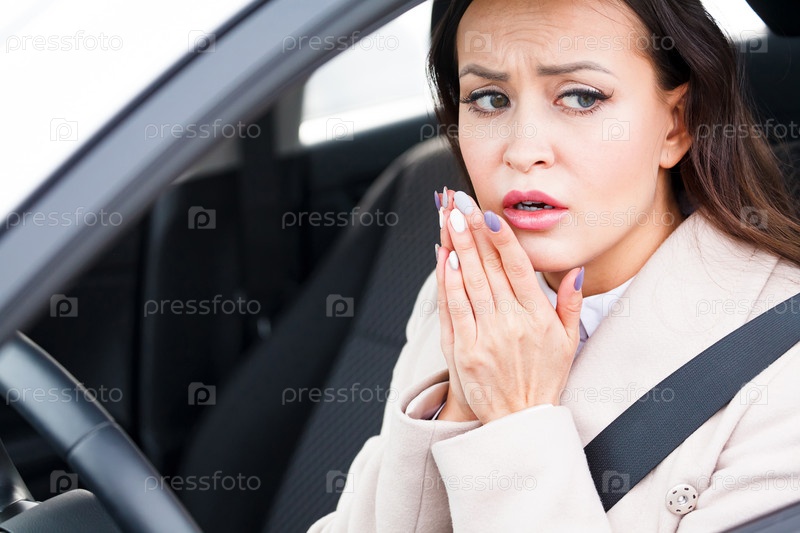 Ближайший снимок стрессовой молодой женщины-водителя в автомобиле