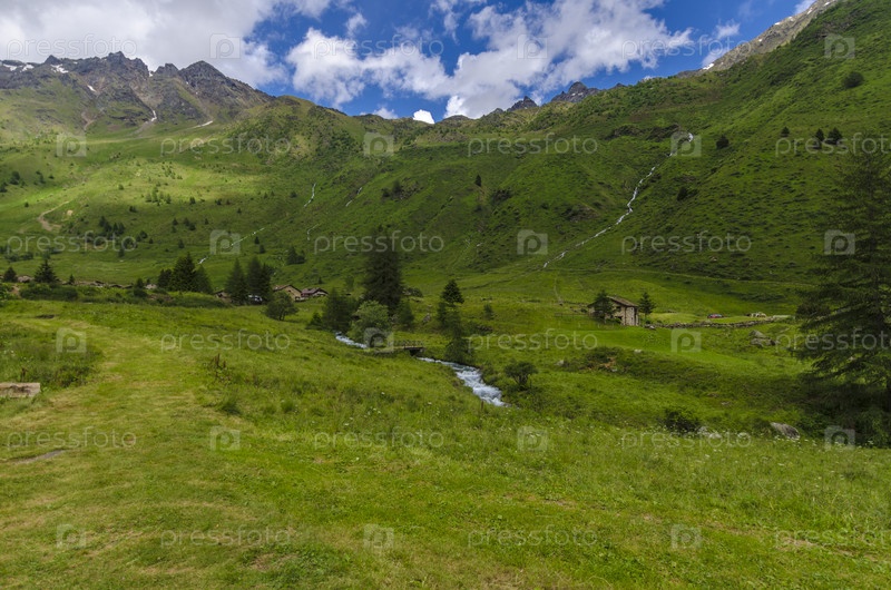 Зеленая долина в Альпах на фоне горных вершин