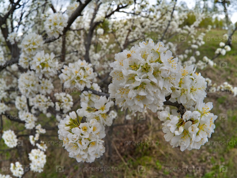 Россия, Юг Западной Сибири. Одинокое дерево алыча (дикая слива) в белом весеннем цвету майским теплым днем