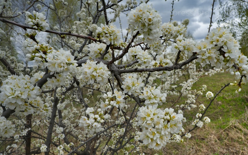 Россия, Юг Западной Сибири. Одинокое дерево алыча (дикая слива) в белом весеннем цвету майским теплым днем