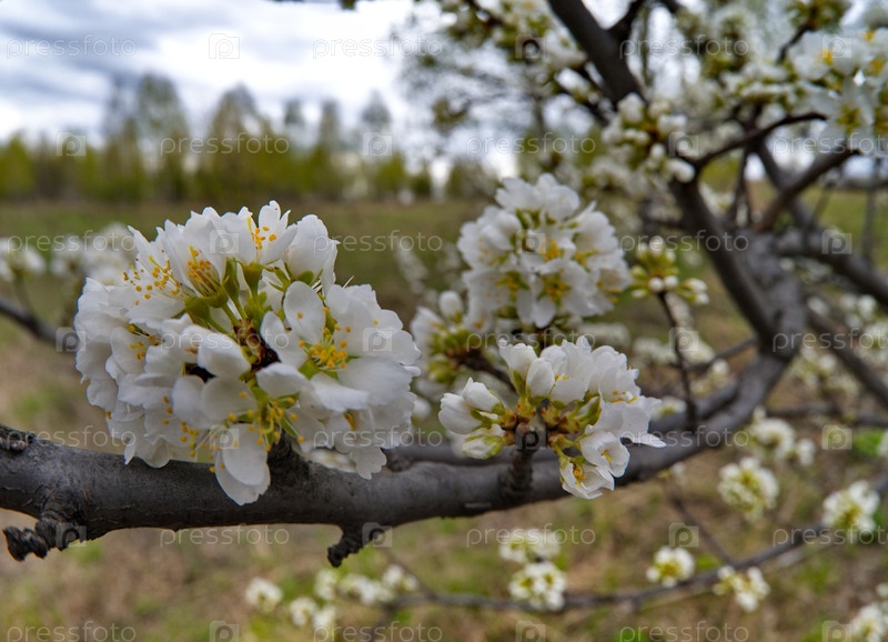 Россия, Юг Западной Сибири. Одинокое дерево алыча (дикая слива) в белом весеннем цвету майским теплым днем