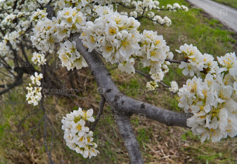 Россия, Юг Западной Сибири. Одинокое дерево алыча (дикая слива) в белом весеннем цвету майским теплым днем