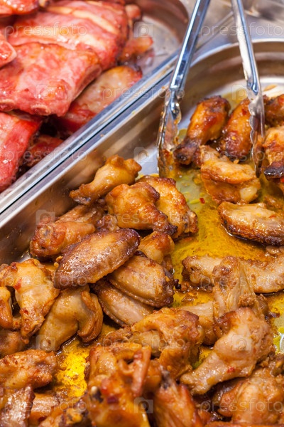 Приготовленные куриные крылья с соусом и кухонными щипцами на стойке супермаркета