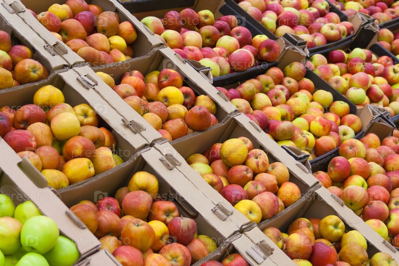 Куча яблок в коробках картонных коробок на ларьке в супермаркете