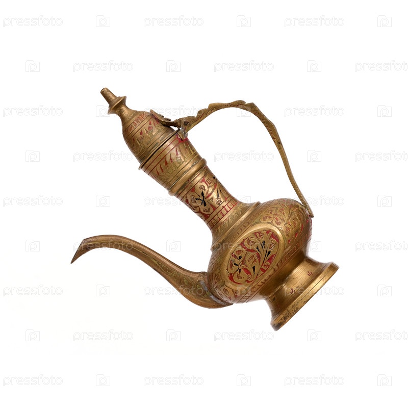 Классический бронзовый индийский кувшин для воды (кумган) , изолированный на белом фоне