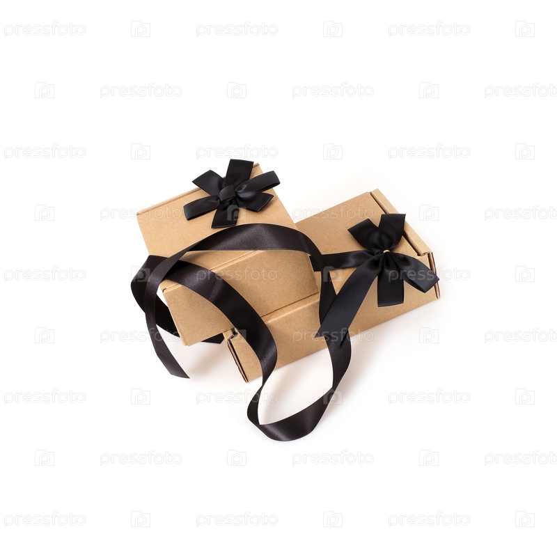 Две коробки с черным носом и лентой, изолированные на белом фоне