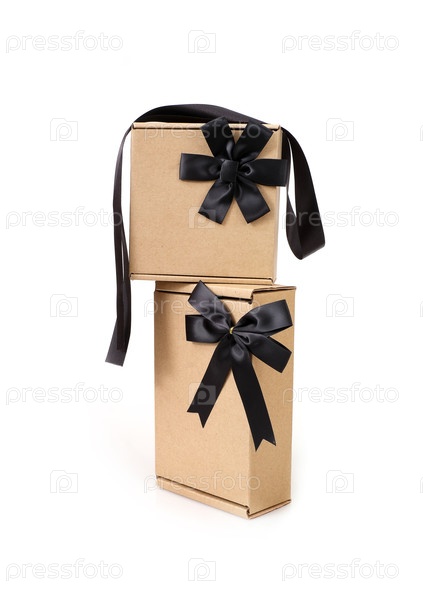 Две коробки с черным носом и лентой, изолированные на белом фоне