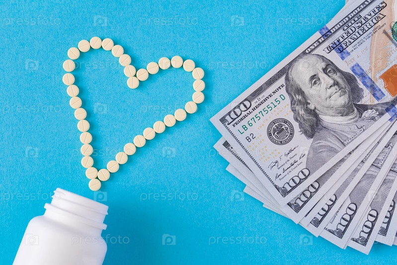 Желтые таблетки выложены в форме сердца. Белая банка и стодолларовые банкноты, на синем фоне (концепция, плоская кладка)