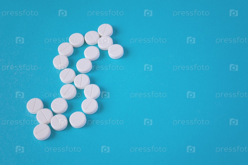 Верхний вид белых таблеток выложен в виде символа доллара на бирюзовом фоне с копировальным пространством (концепция)