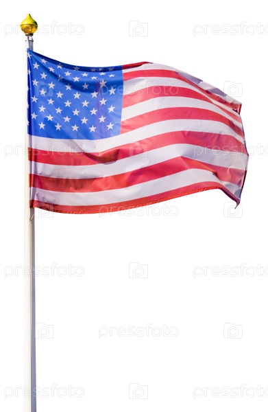 Флаг Соединенных Штатов Америки, развевающийся на ветру, на белом флагштоке с позолоченным наконечником (изолированный)