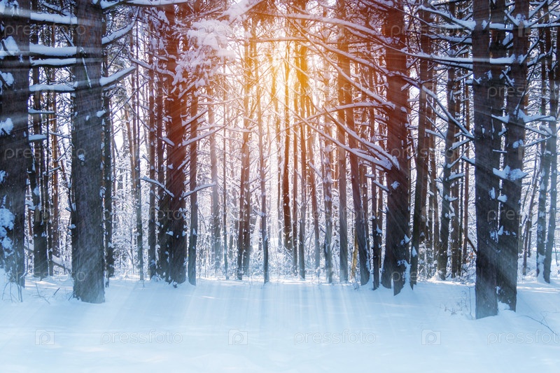 Зимний сосновый лес с солнечными лучами и солнцем (тонированный)