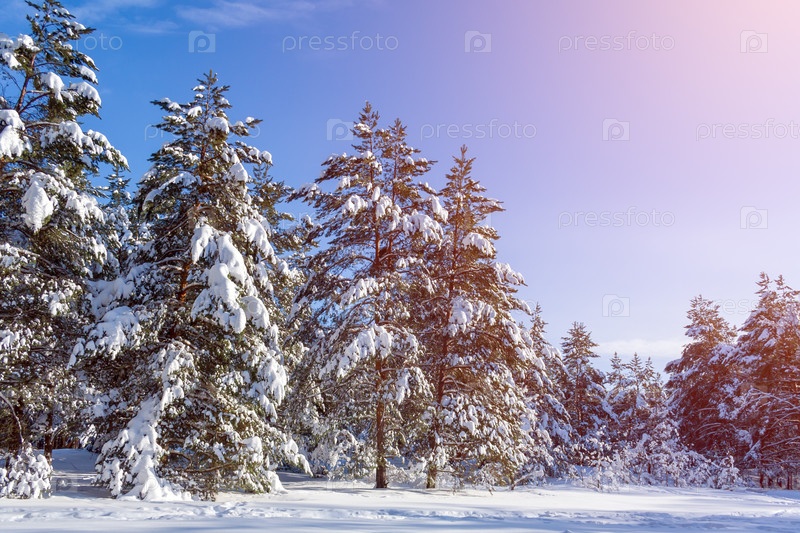 Зимний еловой лес на фоне ярко-голубого неба и солнечного света