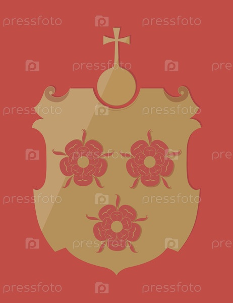 Золотой геральдический щит с розами и глобусом-крестигером, изолированным на красном фоне