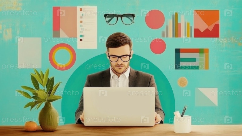 Менеджер верстает годовой отчет на ноутбуке