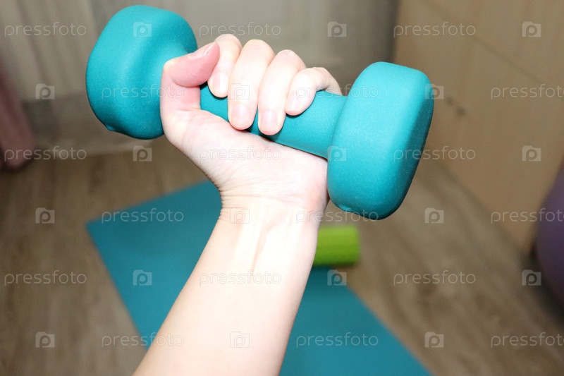 Гантель в руке женщины на фоне фитнес-коврика в комнате. Упражнение для мышц рук