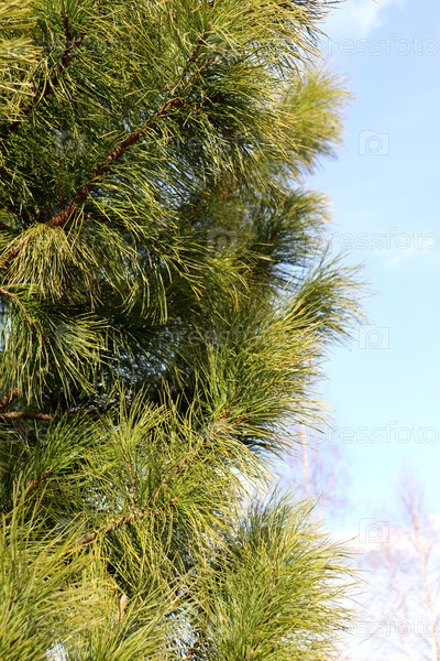 Кедровые зеленые ветви в солнечном свете на фоне голубого весеннего неба