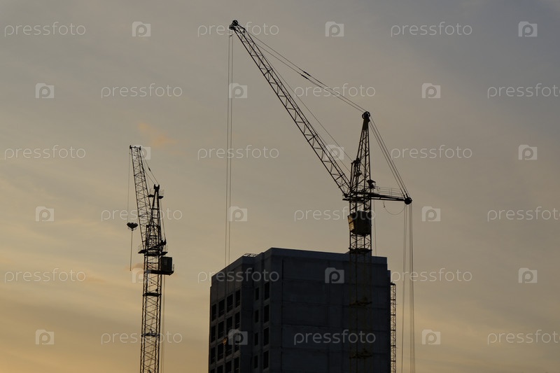 Башенные краны на строительстве жилых домов. Вечернее небо на закате солнца