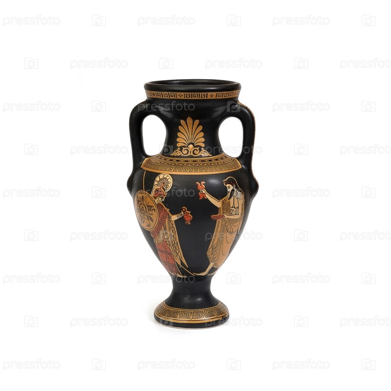 Сувенир из Греции в виде вазы выделен на белом фоне с мифологической фигурой