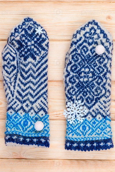 Теплые синие вязаные рукавицы с зимним рисунком близко