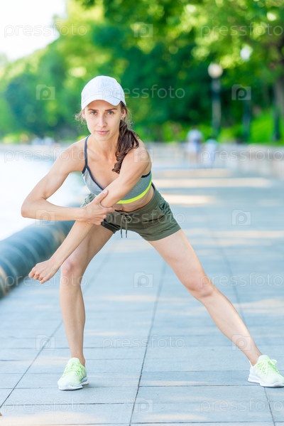 Разминка на городской набережной перед пробежкой, портрет спортсменки