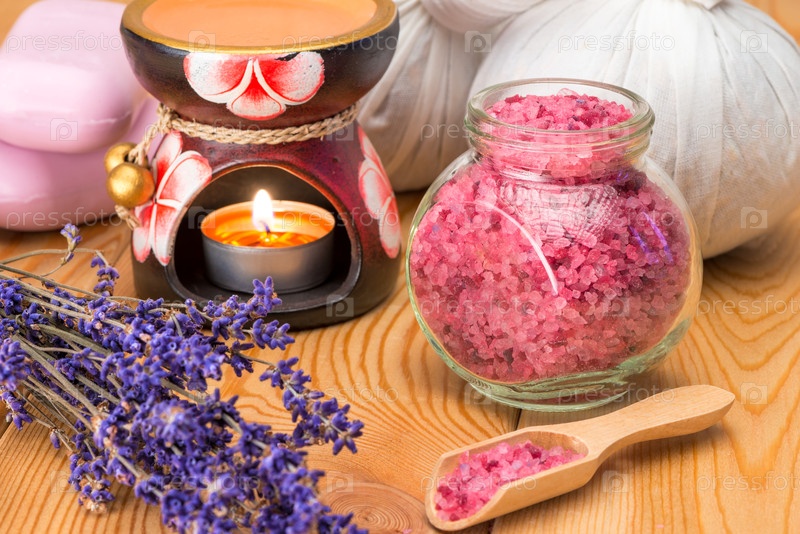 Куча высушенной лавандой, морской солью и горящими спа-объектами свечи закрываются