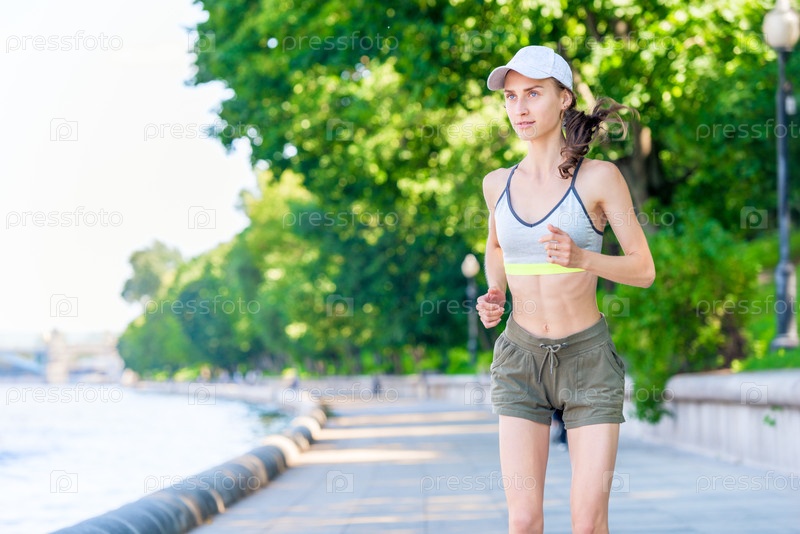 Портрет бегущей спортсменки на набережной в городском парке в спортивной одежде