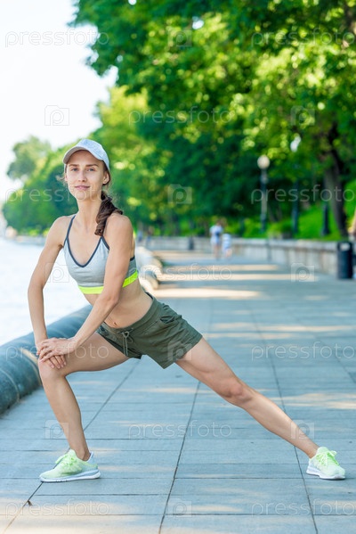 Веселая женщина в спортивной одежде с мускулистой фигурой согревается на городской набережной перед пробежкой