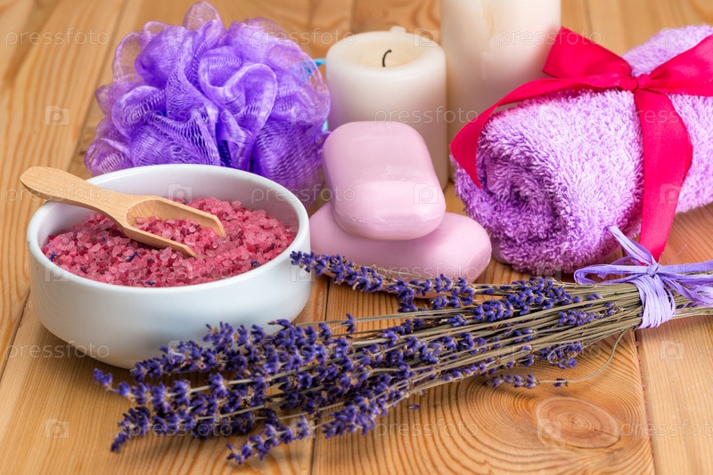 Букет сушеных цветков лаванды, розовое мыло и морская соль с ароматом лаванды, спа-объекты близко