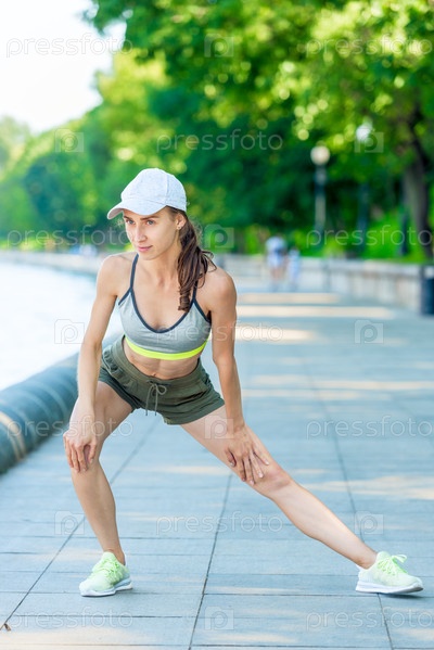 Женщина в спортивной одежде с мускулистой фигурой прогревается на городской набережной перед пробежкой