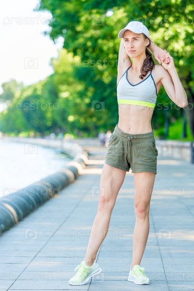 Девушка с мускулистой фигурой согревается на городской набережной перед пробежкой